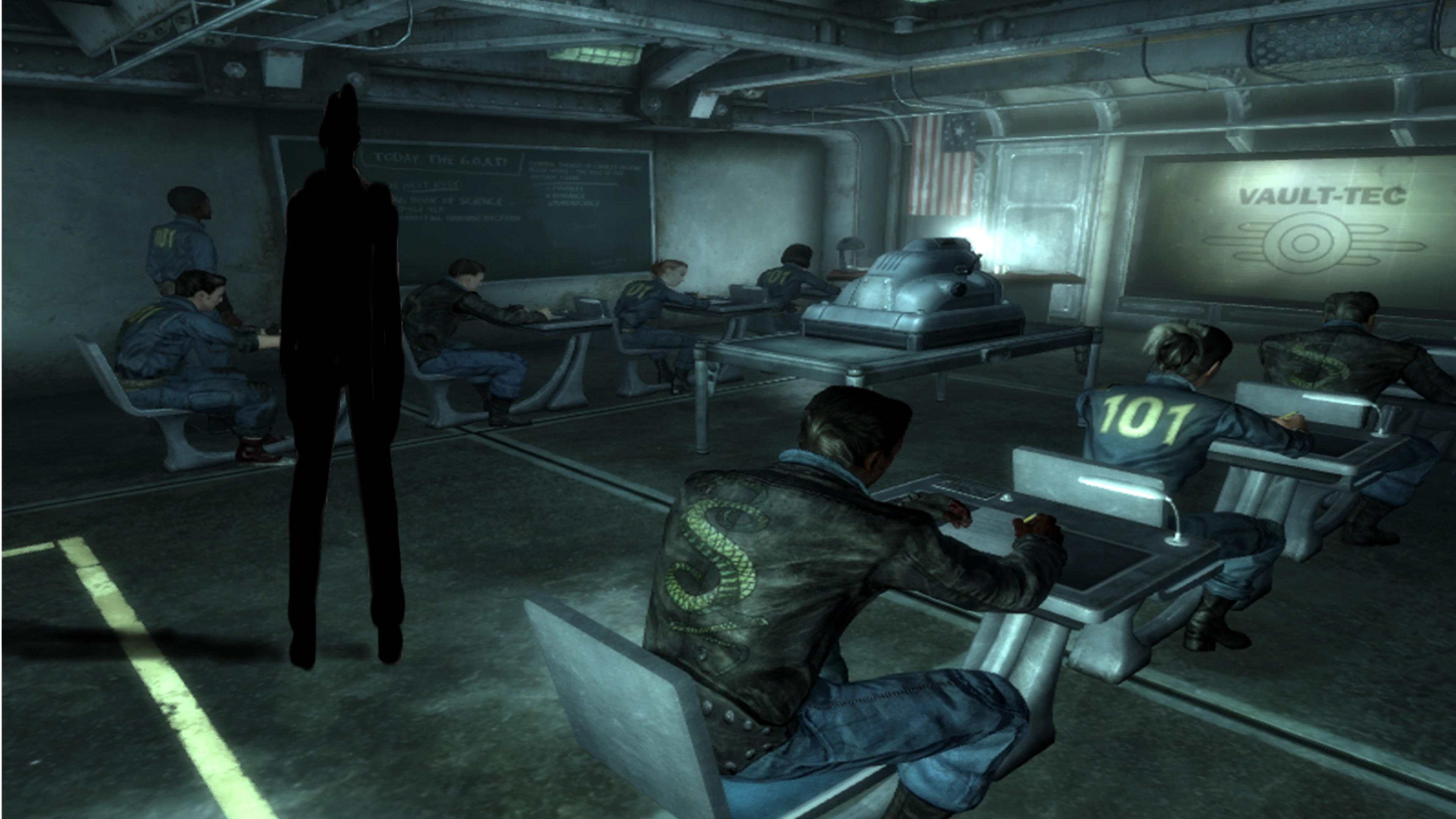 However, it would not be long before we stopped thinking this was an easter egg. We were now at the part where you take the goat test. It’s supposed to test out what type of job would be good for your character. Ralph’s test results said he would be a “capital wasteland manager.” However, just as he was leaving the room he did the test in, we all noticed something. The screen began to bloat and shrink in certain sections again, but there was something else. In the corner of the room, there was some sort of dark shadow. Rico said “What’s that?” Ralph decided to take a closer look. Suddenly, a tall man with a brown business suit from the sixties walked out of the shadows of the corner of the room. Ralph walked near the figure, who began mumbling indistinctly to himself. Rico managed to make out a few words of what the man was saying, including “China,” “attack,” and “collapse.”