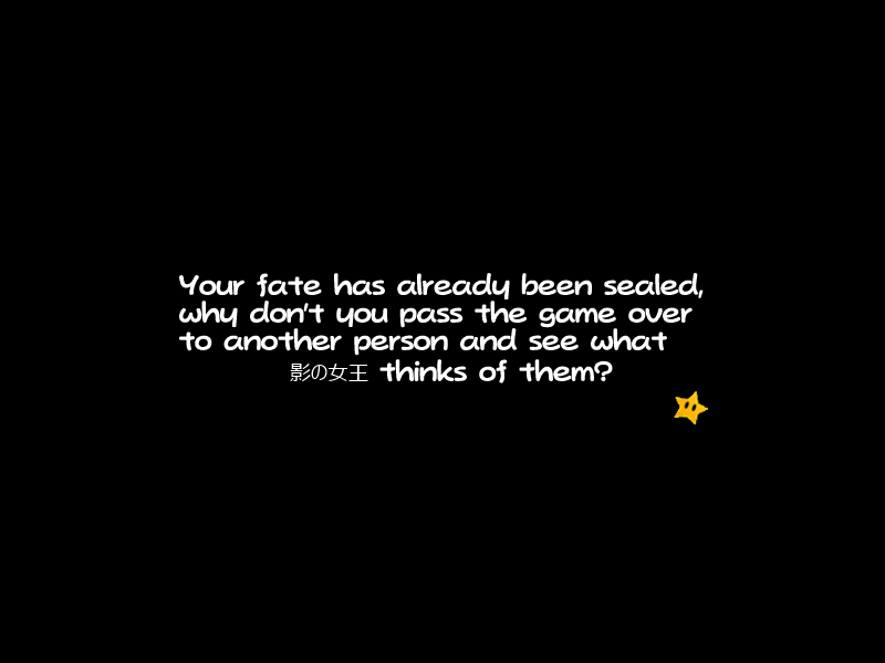 It was the normal title screen, except Mario had no eyes. I thought about what happened, and tried to load my file. Then the screen went black and gave me white text that said in English: "Your fate has already been sealed, why don't you pass the game over to another person and see what (Japanese text) thinks of them?"