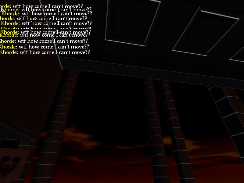 I knew there was someone else in the game. There had to be. Whoever this guy is, he's probably laughing at my attempts to climb the stairs without my jets. What kind of damned fool am I? I typed in the chat: "Hello there :)" After waiting a few seconds, I got a response. The message read: "h e l l o K hor de." My screen suddenly froze in place. The chat began to flood with that same message over and over again. My mouse froze up, my keyboard became unresponsive. I couldn't suicide, quit the game, or look around, I could only chat. I replied: "wtf how come I can't move???" Just after I took this screen-cap, that's when my game froze.
