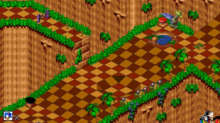 This/It depicts Sonic 3D Blast, a classic SEGA game, being played on an emulator. As I navigate through the level, I encounter a bizarre glitch. A trampoline, usually vibrant in color, appears in a palette of dark hues, almost black. The sprites of Sonic seem to meld with those of Ecco the Dolphin, Vectorman, and Ristar, creating a surreal amalgamation of characters. But what truly unsettles me is the figure hidden in the background – the mascot of SEGAC0de_0, glitched and devoid of pupils in its eyes.
