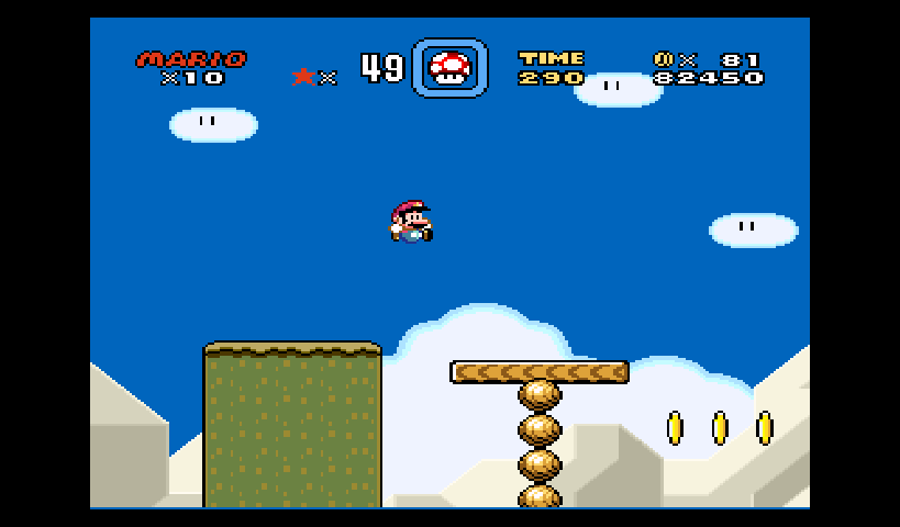 After it happened, it took me a couple tries to get the right screenshot for it, but I set up the slow down and rewind keys, so it became easier. This wasn't in there originally. It really confused me, and so I made it my mission to find out what the hell is happening in this game. I quickly made my way to CoolROM. When that failed, I went on to ask some representatives an Nintendo. When I ran out of options, I decided to keep playing. And why the hell not? At worst I'll end up being even more confused. So after being careful to NOT die of a bullet wound, (lol,) I progressed to the end of the level. I hit the switch, everything normal, and then came the levels to the right of the screen. The first one did something interesting. Where I should have received a Yoshi egg, I instead got a red shell.