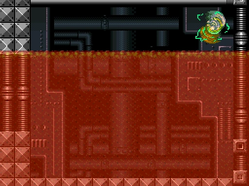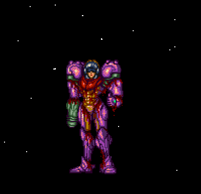 After a few moments it filled the entire room Samus sunk to the bottom. I panicked, trying to find an exit but the room had none. Samus's health tanks drained rapidly until it froze. It then went to the white death screen with Samus's armored sprite. Instead of bursting open normally with the Final Cry sound, small red pixels dripped from the seams of the suit.