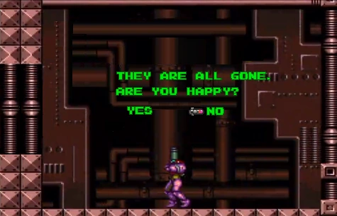 Samus stood up with the hyper beam and started to kill Mother Brain. 10 seconds and she was dead. Instead of the countdown to evacuate the planet, nothing happened. A text box came up, but instead of evacuate it said, “Are you happy?” I pressed a few buttons and another one came up. “All of them are gone. Are you happy?” and it came up with a yes or no option. I thought about the gameplay. It was rather boring. No, I most certainly was not happy. I selected no. The room slowly filled with lava. I jumped with screwball and continued space jumping in the air to stay out of it.