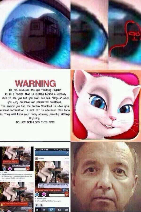 Facebook, February 22nd, 2014, 1:14 AM: The post had well over 1,000 likes. "WARNING: Do not download the app 'Talking Angela'. It is a hacker sitting behind a webcam, able to see you but you can't see him. 'Angela' asks you very personal and perverted questions. The second you tap the button 'download' is when your personal information is shot off to wherever this hacker is. They will know your name, address, parents, siblings, EVERYTHING. DO NOT DOWNLOAD THIS APP!"