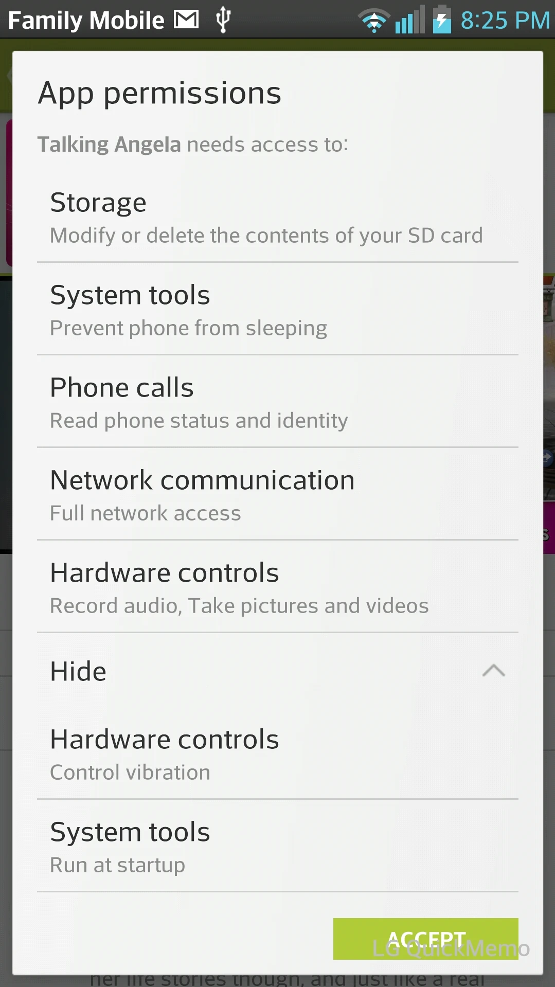 Haha, maybe I was being ridiculous, after all. I decided to review the permissions of the app one last time for good measure, hoping to put my mind at ease. "Hardware controls: Record audio, take pictures and videos."