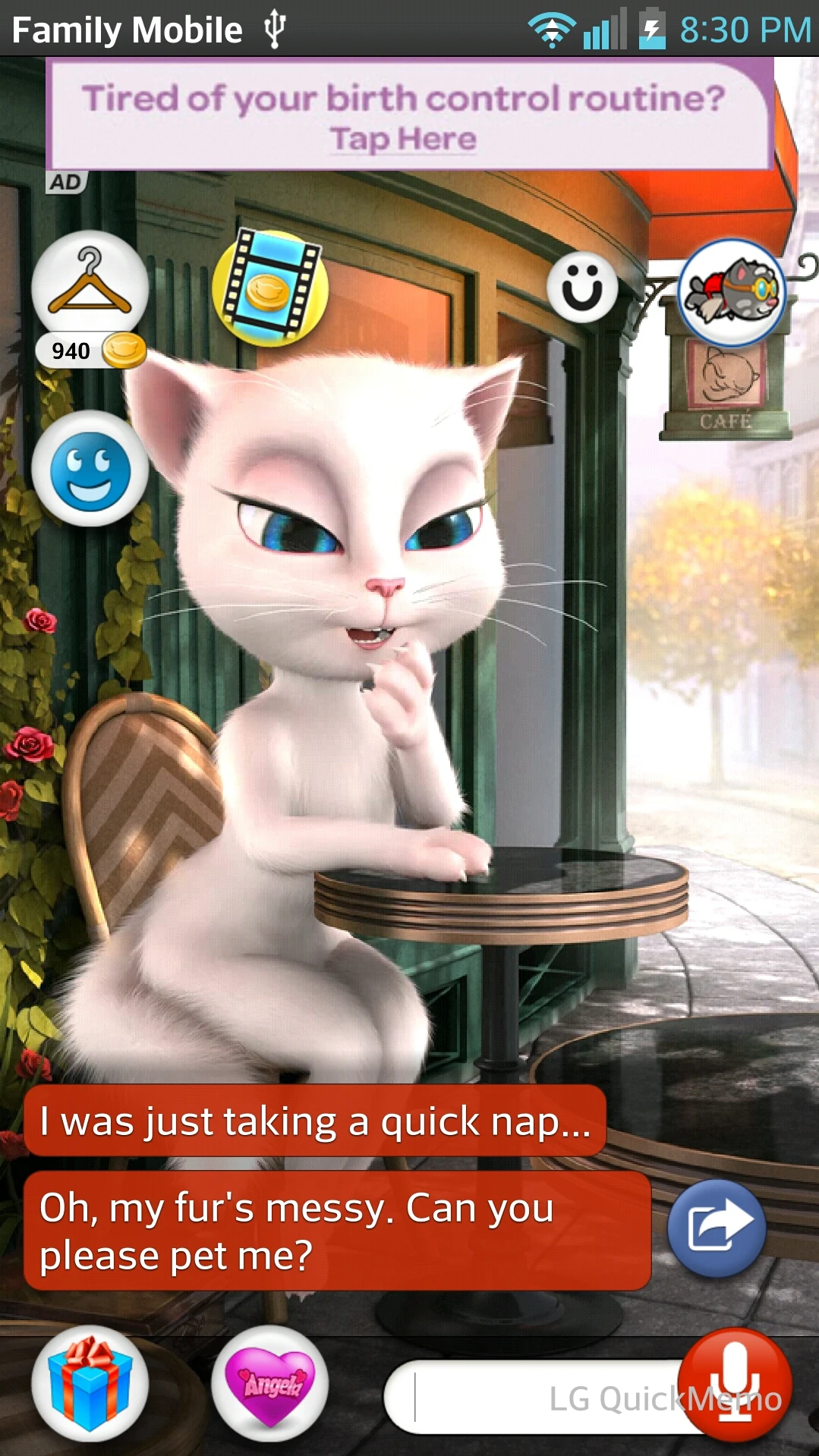 "I was just taking a quick nap. Oh, my fur's messy. Can you please pet me?" This was one of the things I had previously loved about the app. As I stroked my finger across the screen, the meaning seemed to change as Angela did her usual animation. I can't get these thoughts out of my head. What if there really is somebody on the other end? "Record audio, take pictures and videos."