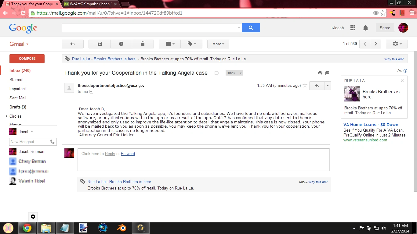 We have investigated the Talking Angela app, its founders and subsidiaries. We have found no unlawful behavior, malicious software, or any ill intentions within the app or as a result of the app. Outfit7 has confirmed that any data sent to them is anonymized and only used to improve the life-like attention to detail that Angela maintains. This case is now closed. Your phone will be mailed back to you as soon as possible, you may keep the phone we've lent you. Thank you for your cooperation, your participation in this case is no longer needed.