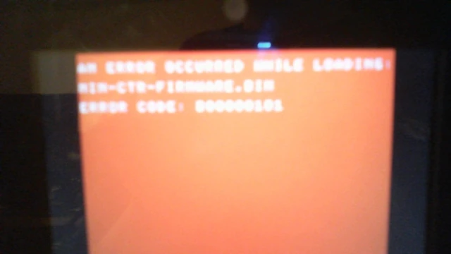 It was hard getting a clear picture of the screen. It says: "AN ERROR OCCURED WHILE LOADING: NIN-CTR-FIRMWARE.BIN ERROR CODE: B00000101" (B00000111 means 7 in binary.)