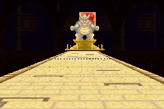 The screen suddenly changed color again which almost made me drop the 3DS. I was now in a track similar to SNES Bowser Castle 2 however it only went in one direction and it was surrounded in a dark abyss. This time no time timer started and there were no other characters just Koopa. He seemed more hunched over than ever before as if he was carrying a huge burden besides his shell. His colors were more lighter and his cart was now a Cloud 9 with mushroom wheels which baffled me as I didn't do anything to get this. His name again changed but this time to "Trapped." I decided to go forward however throughout the entire time, Koopa kept looking back as if something was following him; he had a look of profound agitation of which I could not explain. It wasn't me, it was fully an aut- omatic movement . At one point, I tried to go back but the command wouldn't work so I kept moving the circle pad and pressing the "A" button. No thomps were in sight as well as jump ramps. This track also had no music and when I looked at the map, my heart sank. The question mark was still there but the number of laps was at 3 and then I saw something behind Koopa that made me want to jump. It was another character...based on the icon, it was Bowser however the map did not show him in the character box...just Koopa. That freaked me out but at that moment, I saw a castle (like in the original Mario Bros series) up ahead. Koopa stopped right at the front of the castle (there was also a small sign but it contained unintelligible text) and started to act out his "defeated" movements which were bowing down his head and sighing. The screen cut to black and the last thing I remembered hearing at that stage was a Bowser laugh.