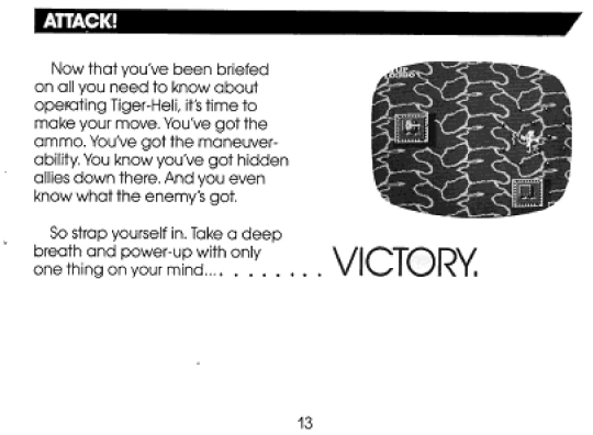 On the surface, Tiger-Heli seems a straightforward good versus evil military confrontation, the player and the country he or she represents being the protagonists, and the Cantun terrorists being the antagonists. The NES version of the game is in English, and the manual depicts the military to which the player belongs as large, organized and well funded. Though it is never explicitly stated in the instruction manual, I do not feel it is a stretch of plausibility to assume that the military power depicted as “good” represents the United States.